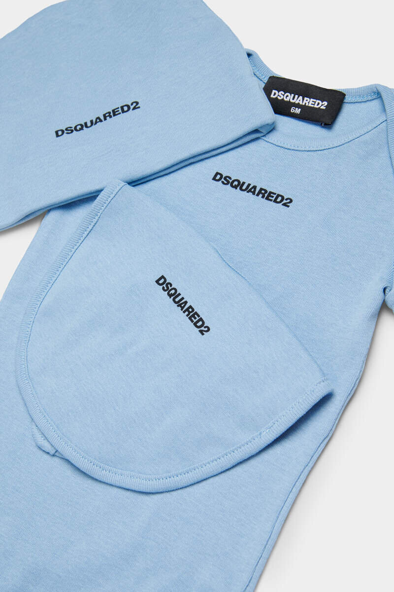Bring a Touch of Iconic Italian Flair to Their First Looks with This Dsquared2 Baby Set – Comprising a Cotton Bodysuit Styled with a Bib for Layering and a Matching Hat, All Accented with the Signature Logo for an Exclusive Touch.