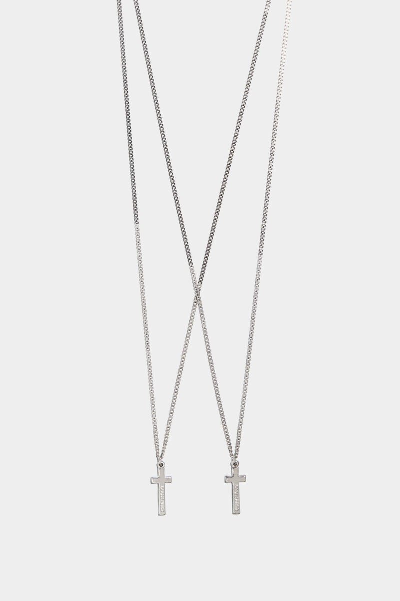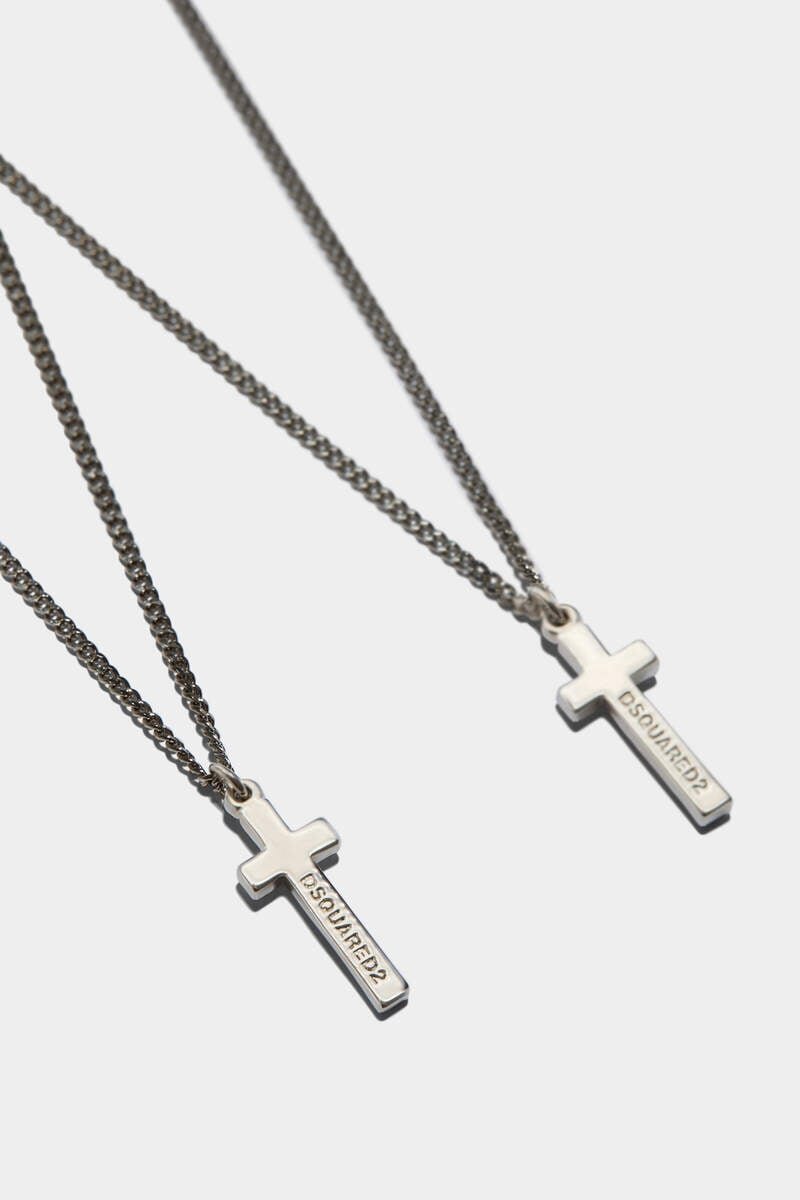 Enhance Your Saturday Night Outfit with This Stylish Necklace in Silver and Grey Metal, Adorned with Twin Crucifixes. Pair with a White, Open-Neck Shirt for an Effortlessly Cool Vibe.