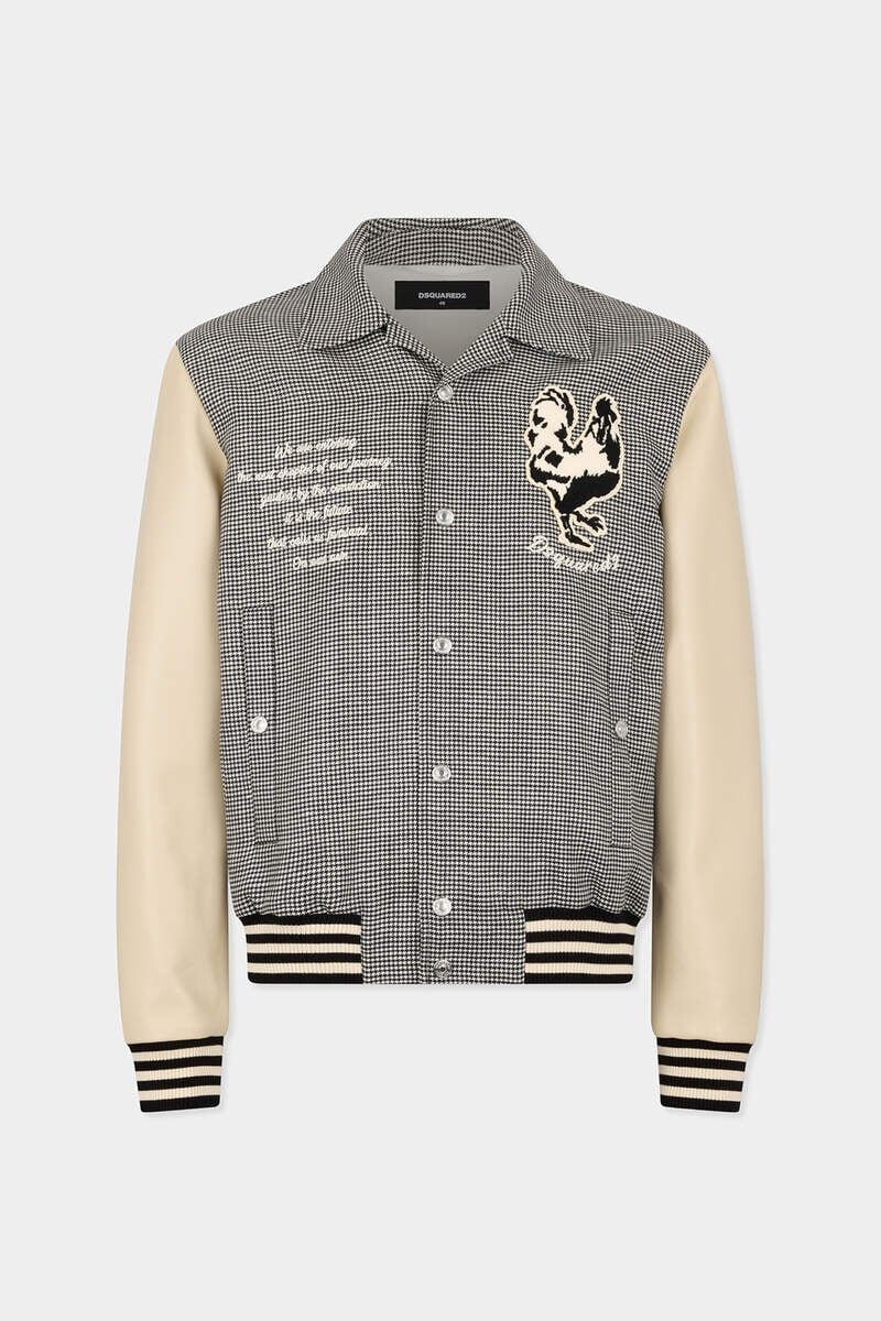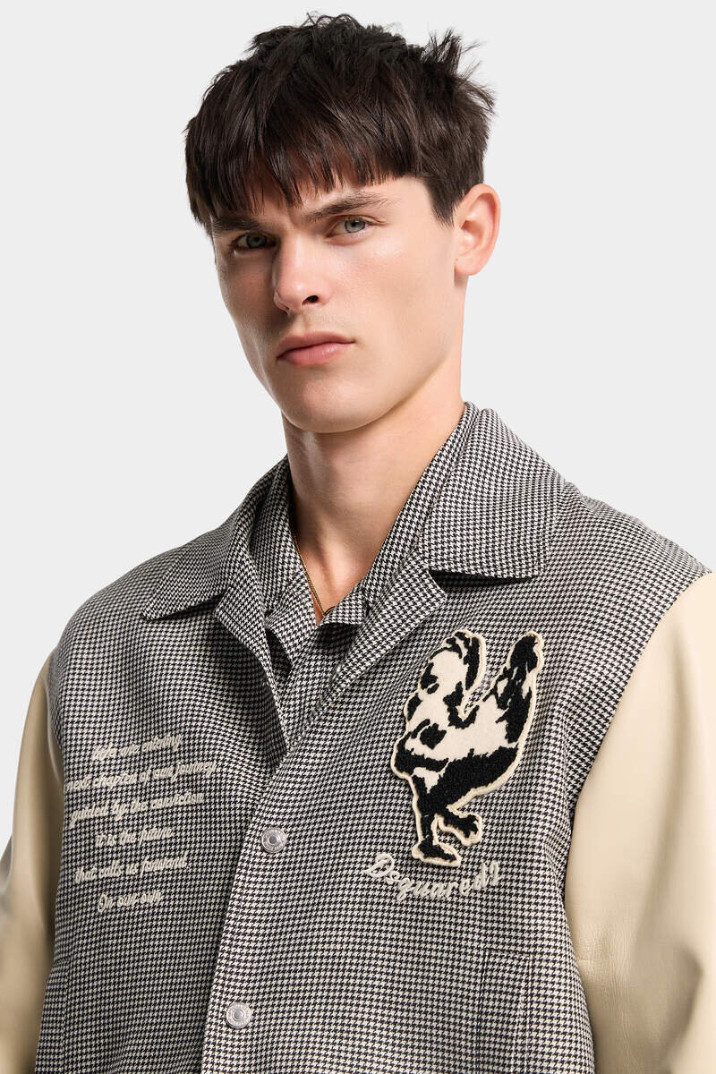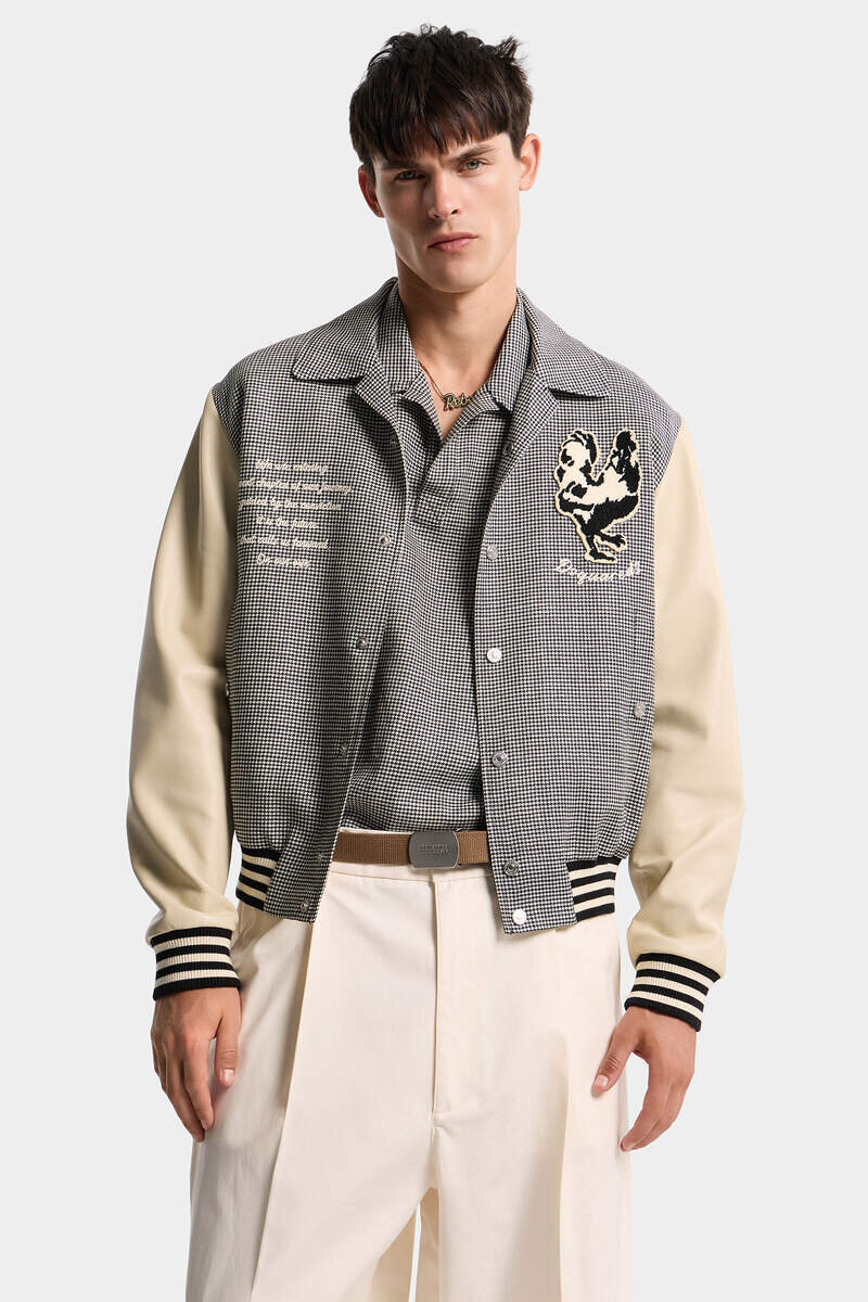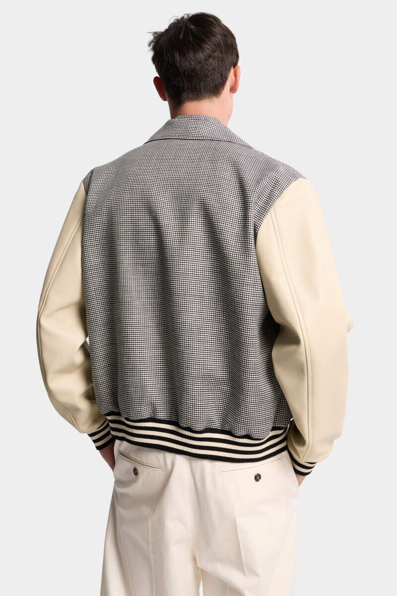 Preppy with a High-Fashion Twist: This Bomber Jacket Pairs a Textured Pied-De-Poule Bodice with Smooth Sleeves and the Season’s Statement Patches. It’s Crafted from a Blend of Virgin Wool and Linen with Elasticated Trims for Definition.