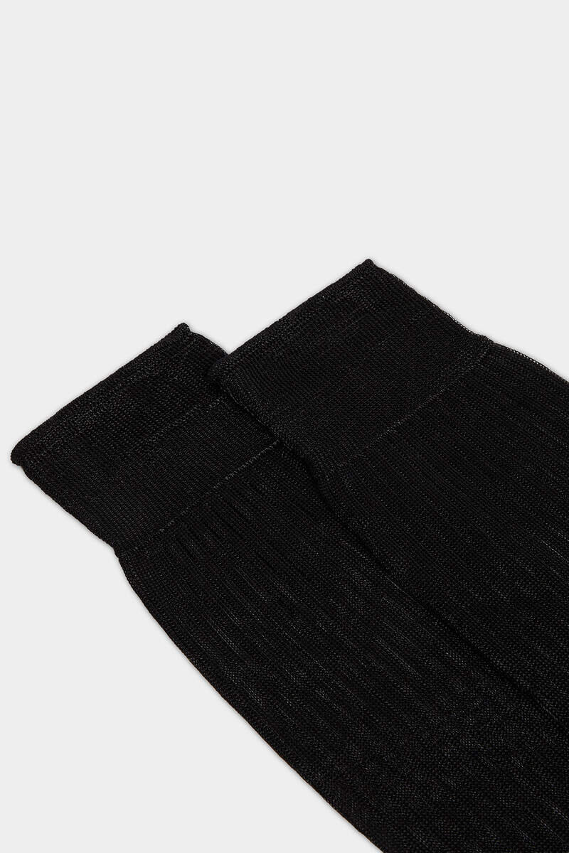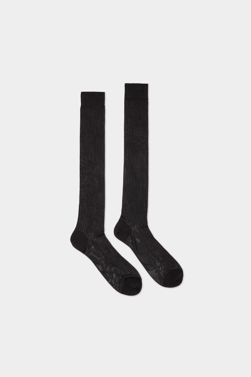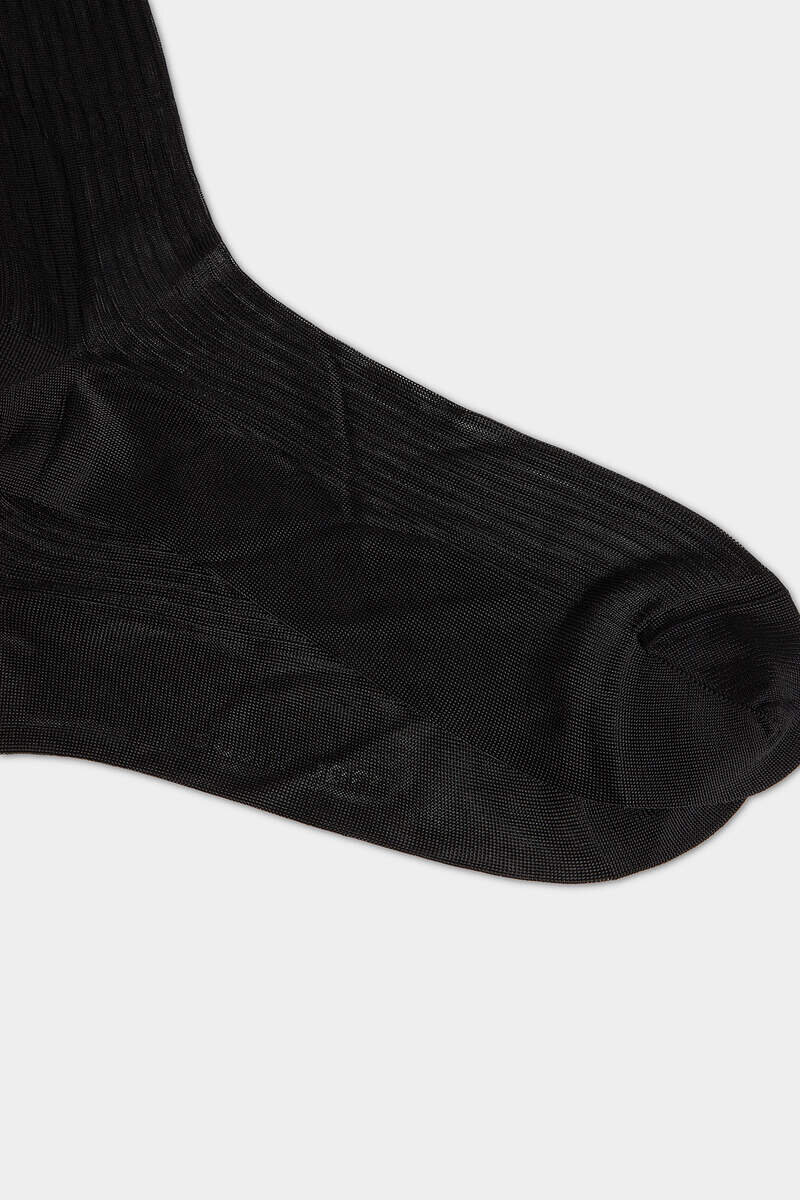 Ribbed Rayon Long Socks, a Durable Yarn That Turns into a Soft, Comfortable Jersey. Perfect for Wearing Under a Classic or Formal Suit, They Stand out for Their Lightness. The Brand is Printed on the Bottom. Toe and Heel Are Reinforced. Elastic Hem Supports Without Constricting.
