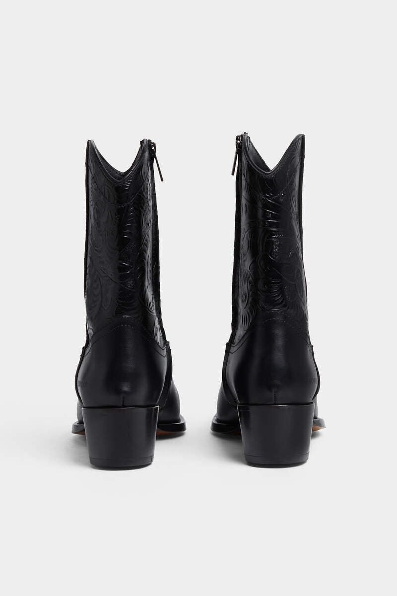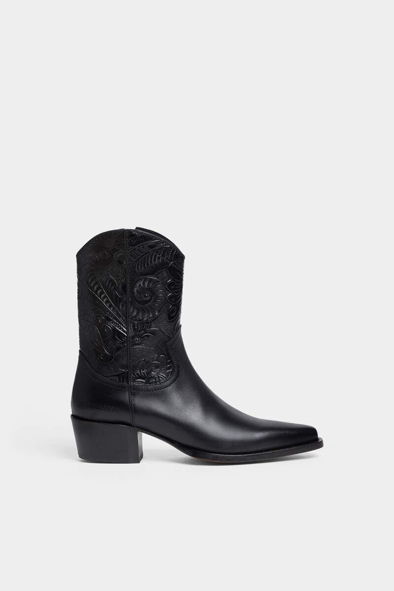 Western Attitude is on the Cards with These Sleek Leather Cowboy Boots, Embellished with Ornate Embossed Detailing. Pair with Jeans or Smart Suit Trousers for a Modern Take on Black-Tie Glamour.