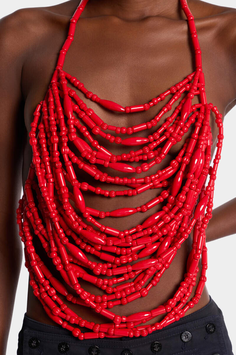 A Jewel Transformed into Fashion. The Coral Top Reimagines the Halterneck as an Oversized Necklace, Skimming the Chest with Cascading Coral Layers. Both Ornament and Garment, It Turns Decoration into Fashion and Makes Attitude the Ultimate Accessory