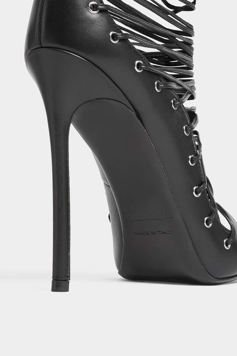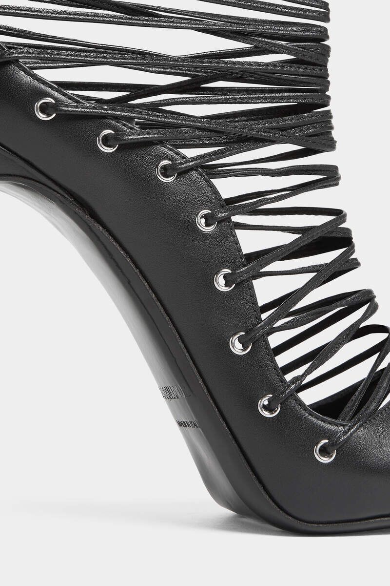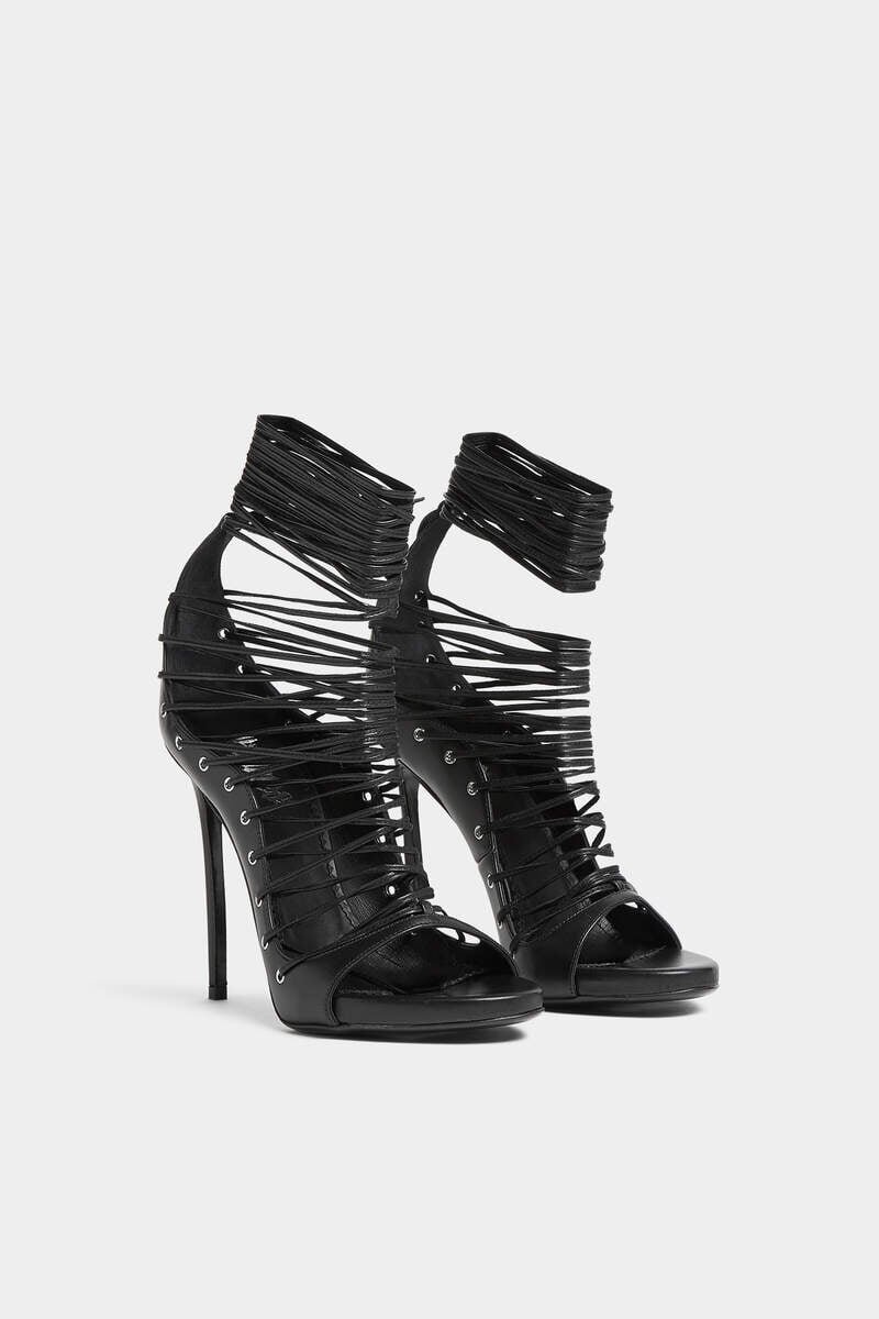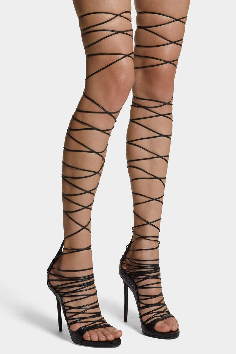 Bring Instant Drama to Evening Looks with These Super-Strappy Heels, Embracing the Leg from Ankle to Calf in Thin Wrap-Around Ties. Metal Eyelet Details Add a Grungy Touch.